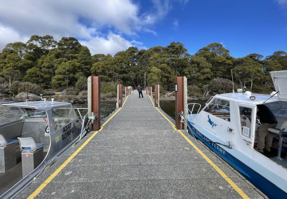 The wharf extends gently over the clear water and is used for boat tours, fishing, and sometimes for hikers starting or finishing the famous Overland Track, which ends here. As we were approaching the wharf, a bunch of people just got of the boat after hiking on the other side of the lake.