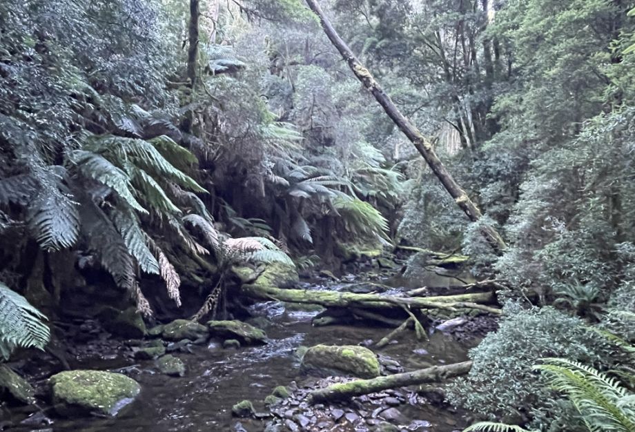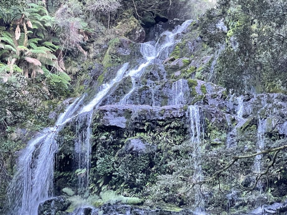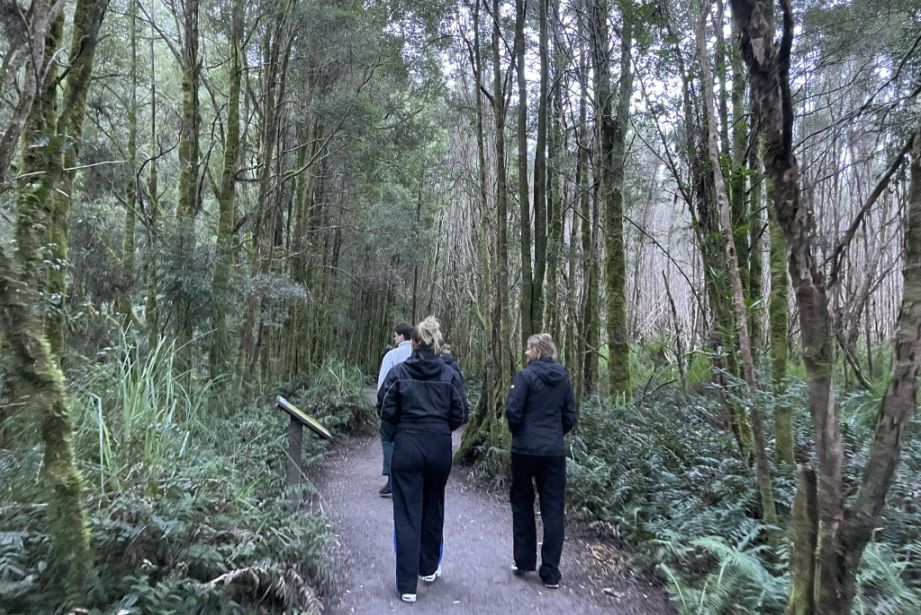 As we walked along the Nelson Falls Track, we followed a stream winding gently through the forest, its clear water glimmering between rocks and roots.