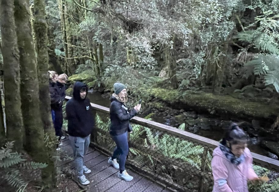 As we followed the well-kept wooden pathway toward Nelson Falls, we are now walking through a cool temperate rainforest filled with a mix of ancient Tasmanian tree species.