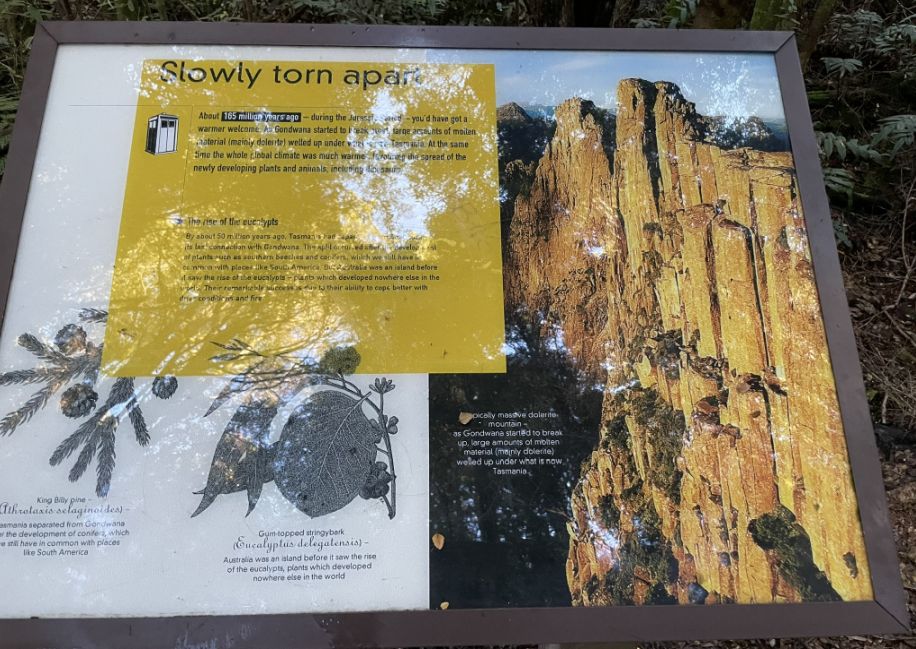 A little farther along, we came across another interpretive panel titled “Slowly Torn Apart.” It described how over millions of years, the landscape around Nelson Falls has been shaped by powerful natural forces by glaciers carving deep valleys, and later by the constant flow of water and erosion. The panel explained how the rocks and cliffs we see today are still slowly being worn down by rain, wind, and the steady movement of the river. It was fascinating to realize that even in such a peaceful, timeless place, the land is still quietly changing.