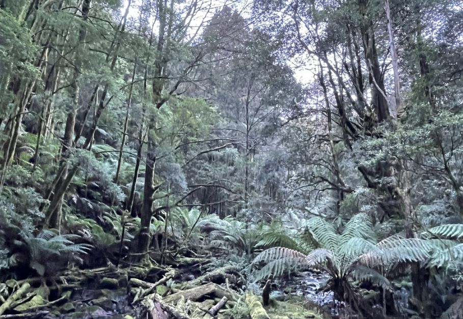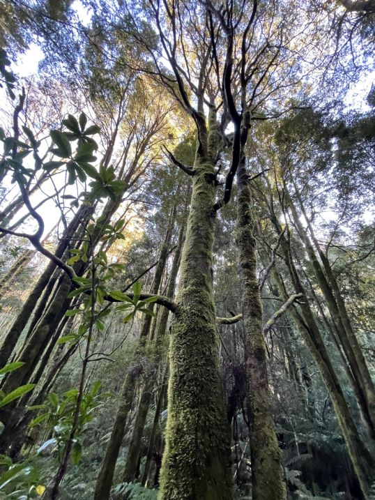 The dominant trees here are myrtle beech (Nothofagus cunninghamii), which have dark, glossy leaves and form much of the dense canopy. There are also sassafras, which gives off a faint, sweet scent when crushed, and leatherwood trees, known for their twisted trunks and creamy white flowers in summer.