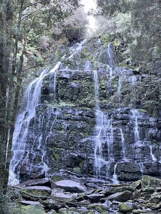 The pathway wound its way through tall myrtle beech trees, their trunks thickly covered in moss from base to branch. These ancient trees are characteristic of Tasmania’s cool temperate rainforests, thriving in the damp, shaded environment around Nelson Falls. Some sassafras and leatherwood trees also grow among them, adding variety to the dense forest canopy.