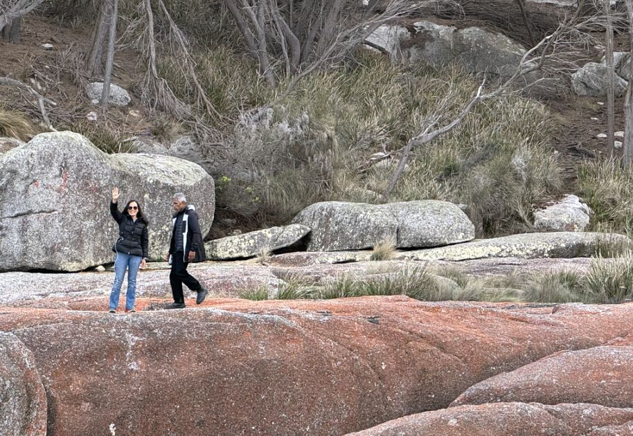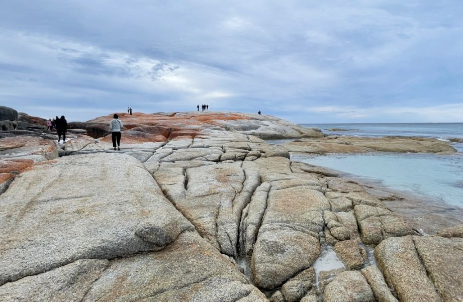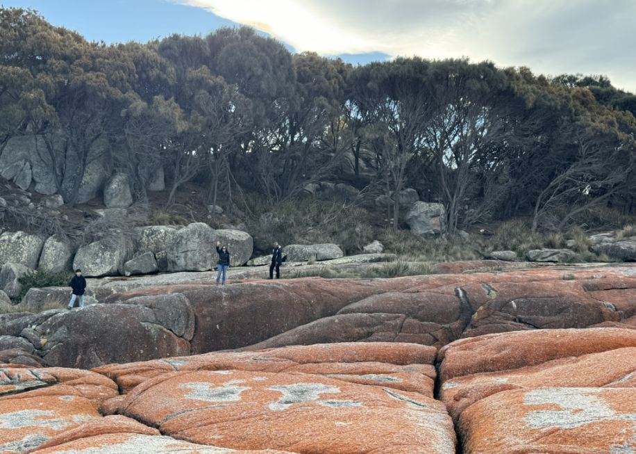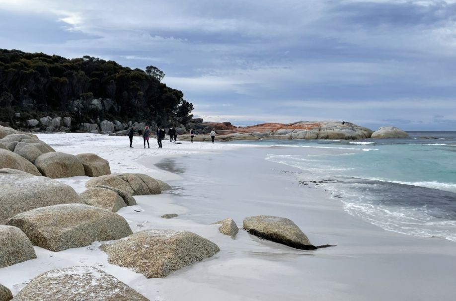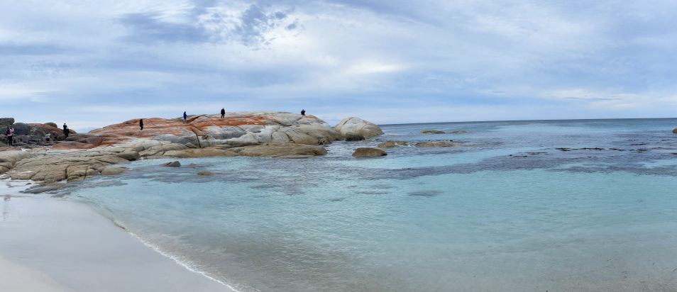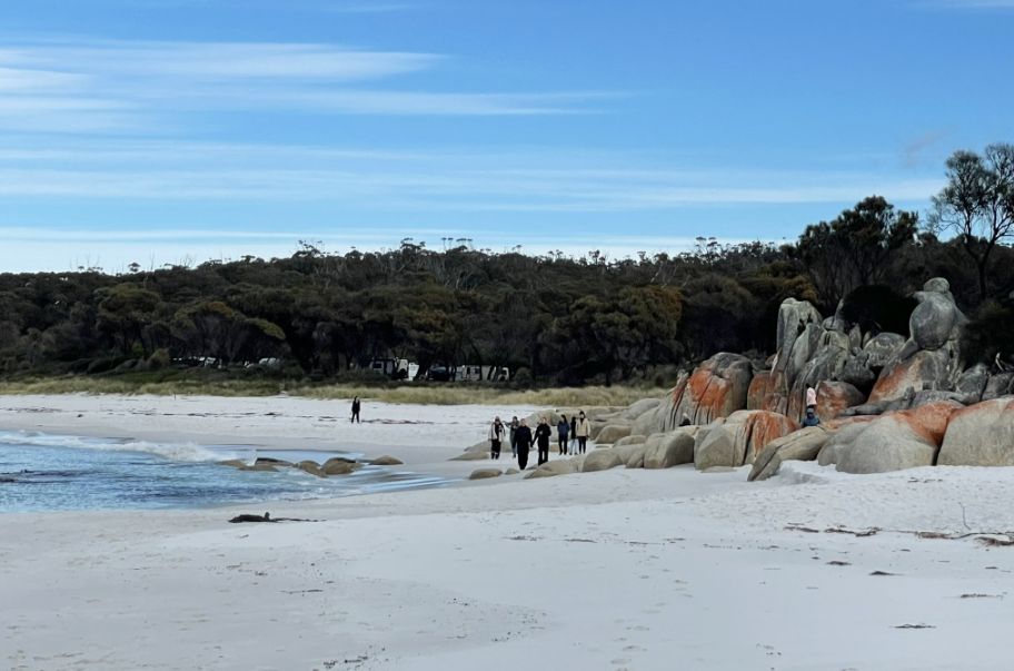 Tom parked the bus and we walked toward the world-famous Bay of Fires Conservation Area where a narrow sandy path opened up to the beach. The entrance was framed by low coastal shrubs and tufts of grass swaying in the breeze. As we got closer, we could hear the sound of waves breaking gently on the shore.