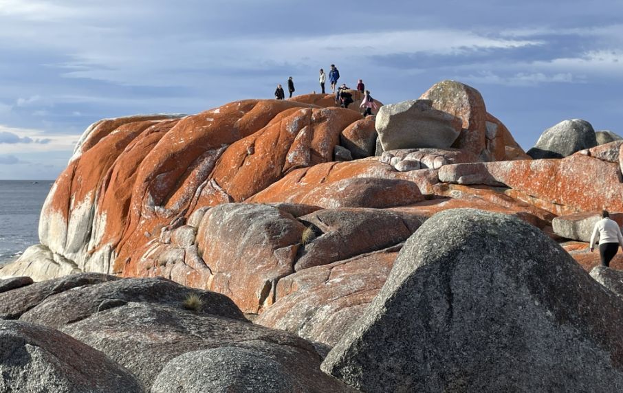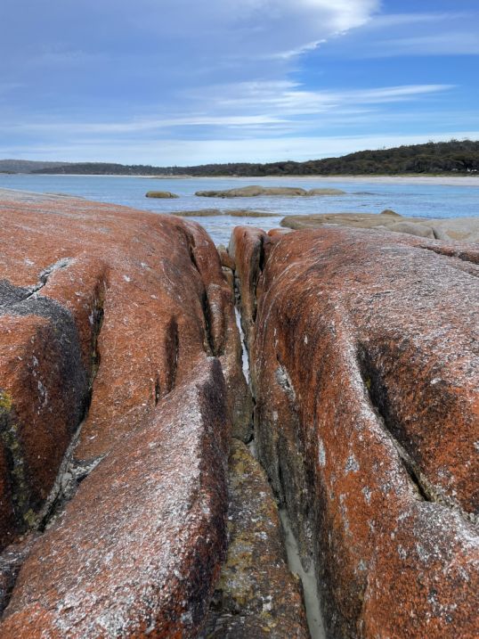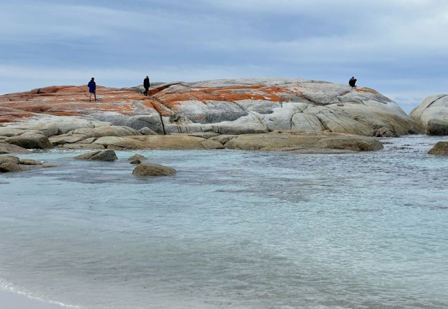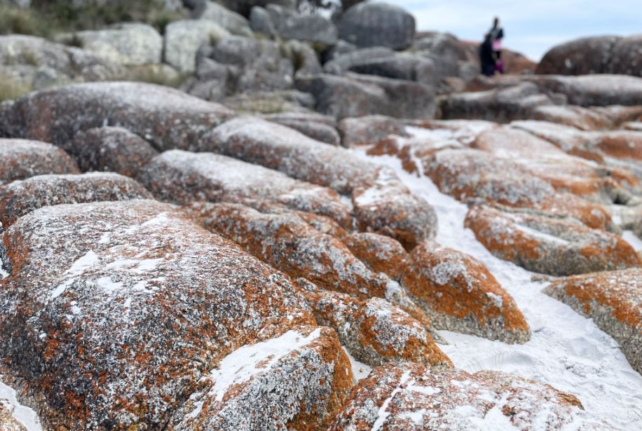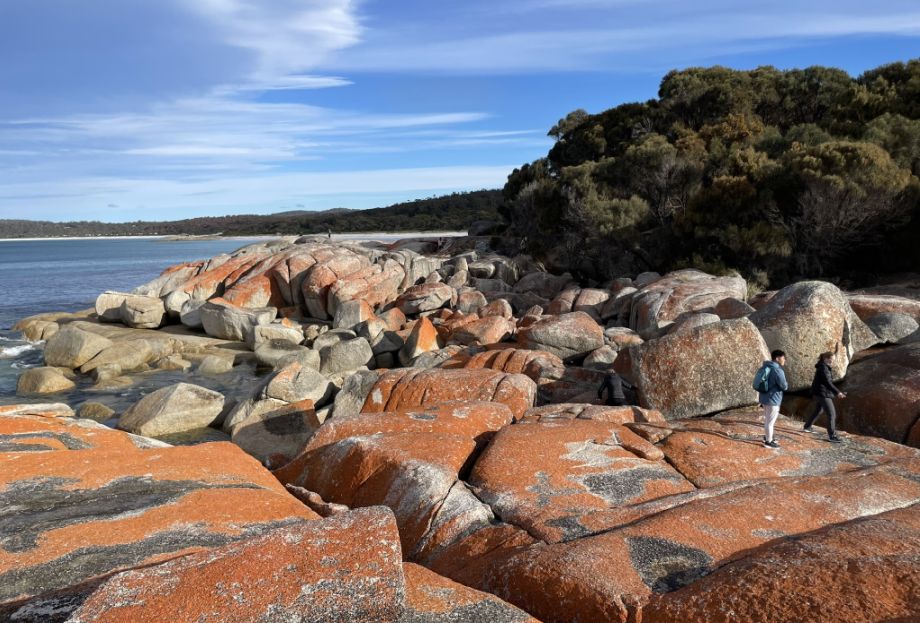 The first impression that the orange lichen looks so much like glowing embers against the white sand that it seems natural to think that’s why the place is called the Bay of Fires. But as I discovered, the name actually has a different origin.