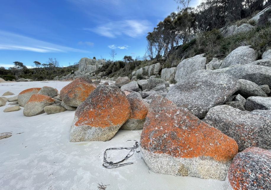 The bright orange pigment is actually a protective compound produced by the lichen to shield itself from the sun’s strong ultraviolet rays and from salt exposure in the coastal environment. Because the Bay of Fires has clean air, steady sea breezes, and little pollution, these lichens thrive, spreading slowly over centuries and giving the rocks their fiery, unmistakable hue. So the “flames” of the Bay of Fires aren’t from fire at all, but from these living, slow-growing lichens that paint the granite with color.