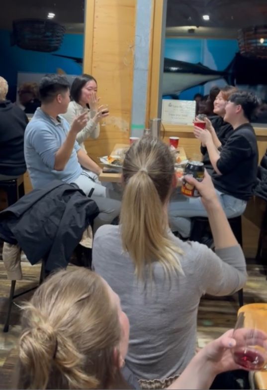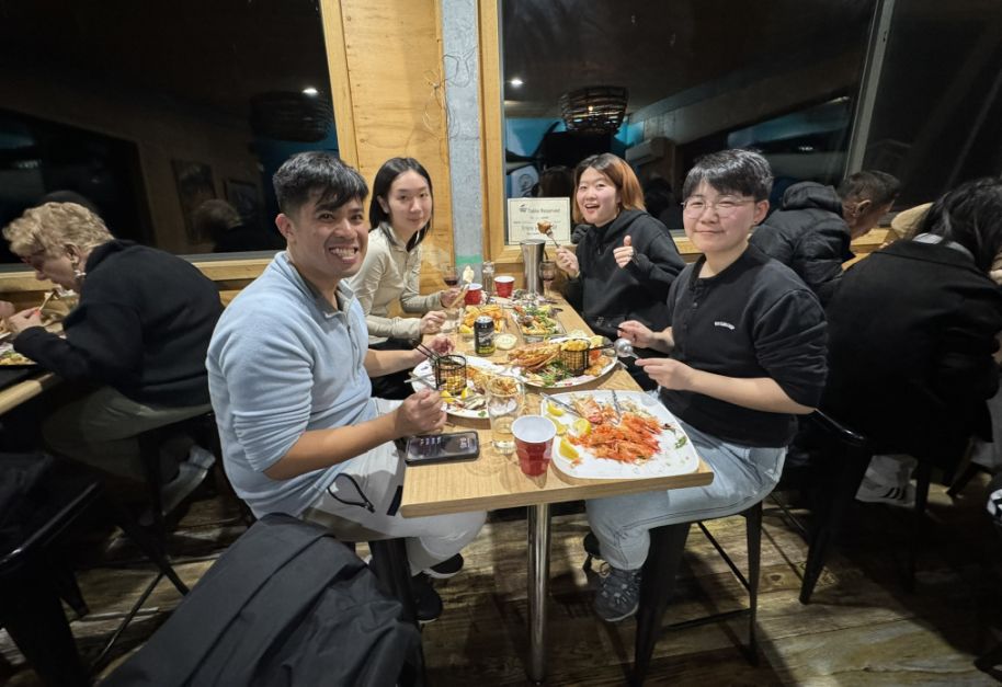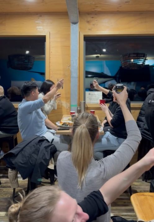 Eifie looked a bit embarrassed as all the attention turned toward her, blushing and laughing as we finished singing and raised our glasses. But even with her shy smile, you could tell she appreciated the gesture. The whole moment felt lighthearted and full of warmth, the kind of spontaneous celebration that makes a trip feel extra special. Between the laughter, the delicious food, and the glow of the evening sky over Waubs Bay, it turned into a truly memorable night, one we’ll all look back on fondly.