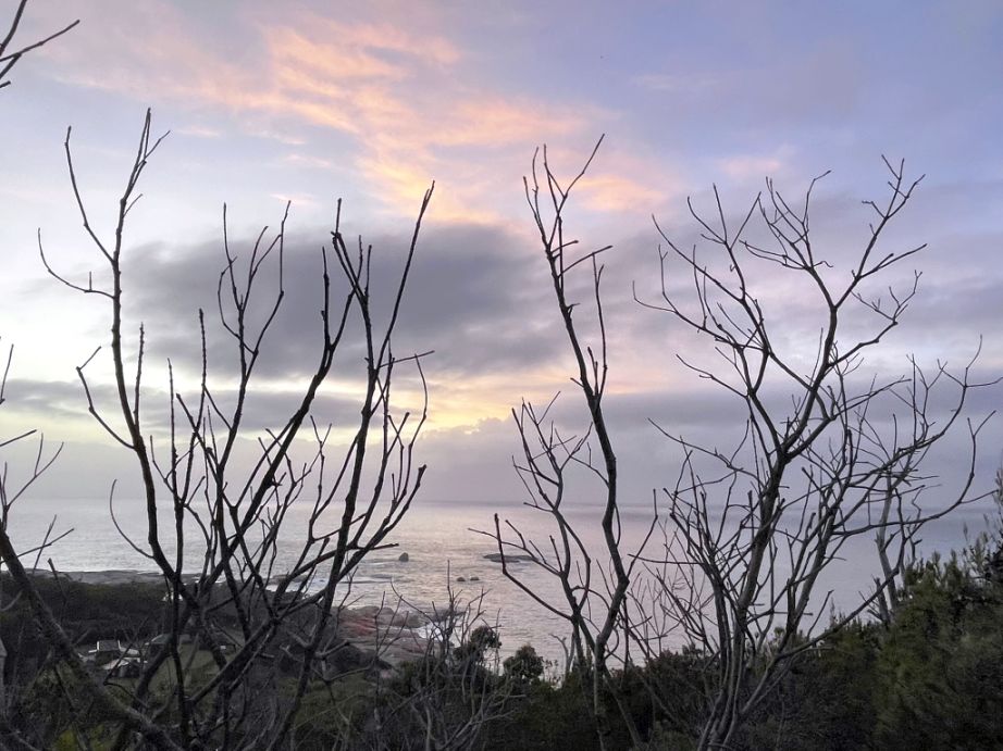 It was a cloudy morning, so we couldn’t see the sun itself rise above the horizon, but the sky slowly began to glow with soft, muted light. The clouds caught the early rays, turning shades of orange and pale gold, casting a warm tint over the bay below.