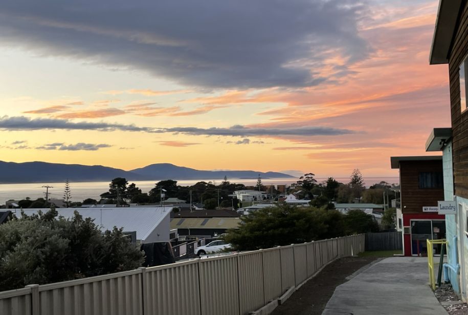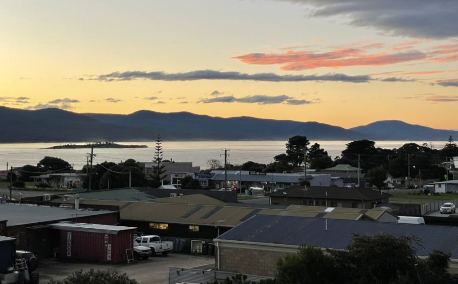 From up here, Bicheno looks peaceful, a quiet coastal town bathed in the golden colors of an autumn evening.