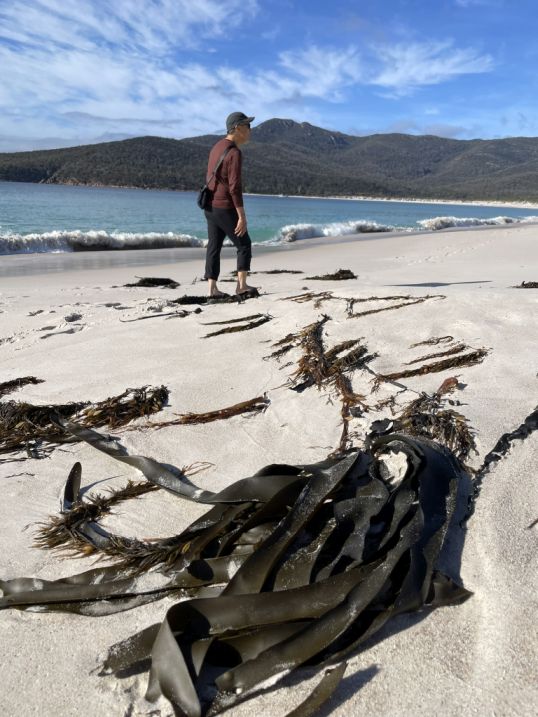 As we walked along the sandy shore of Wineglass Bay, I noticed patches of sea algae scattered near the water’s edge, delicate strands of green and brown tangled together, glistening under the sunlight. Some had been washed ashore by the gentle waves. The algae added a touch of texture and color to the otherwise pristine white beach, a small reminder of the rich marine life that thrives just beyond the shoreline.