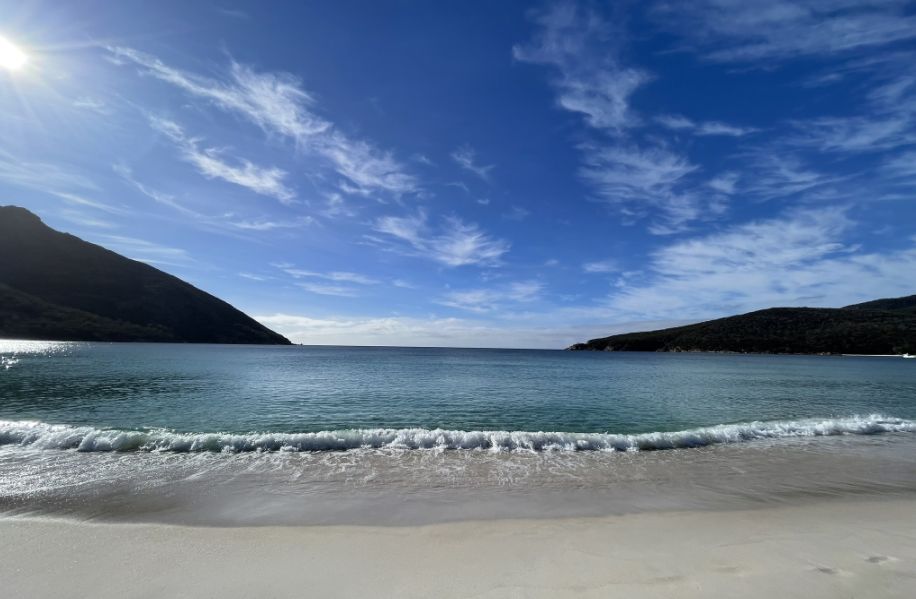 As we finally stepped onto the soft, white sand of Wineglass Bay, the view opened up in all its beauty.