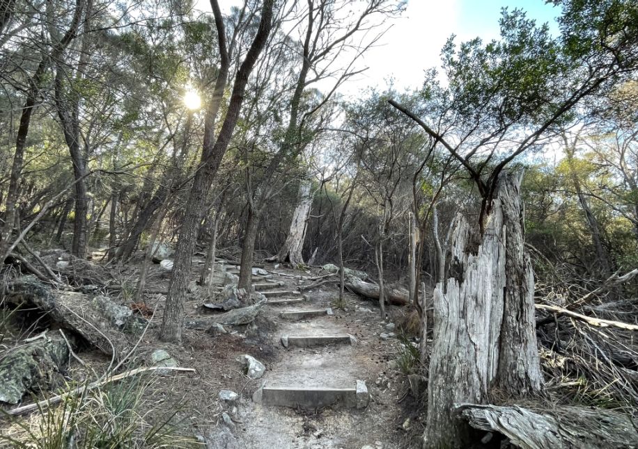 The path is well-maintained but steep, rising quickly from the sand into the dry, rocky bushland above.