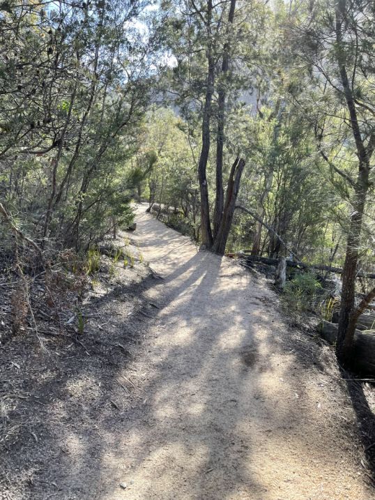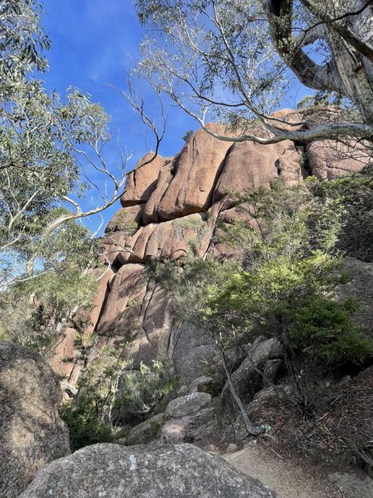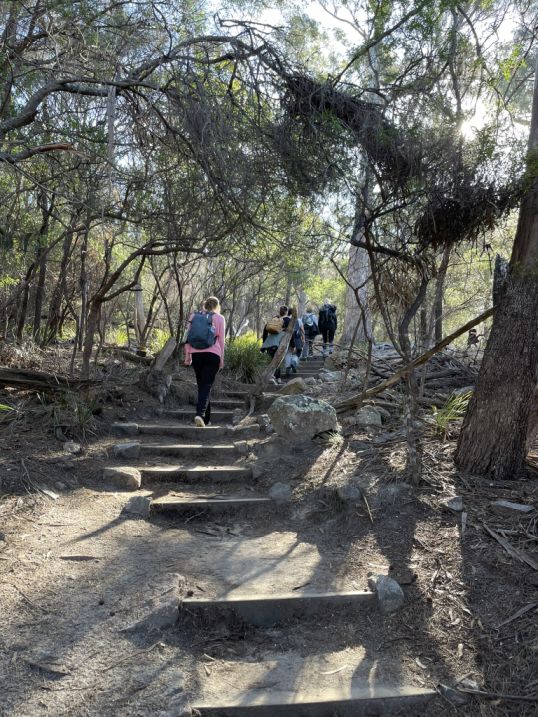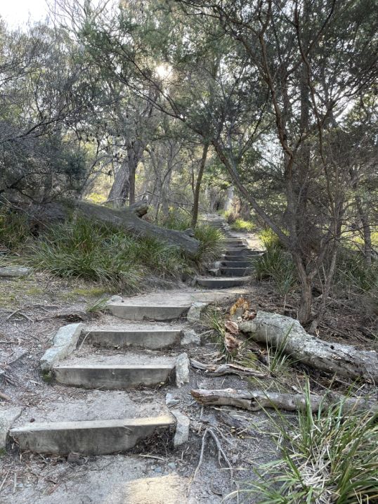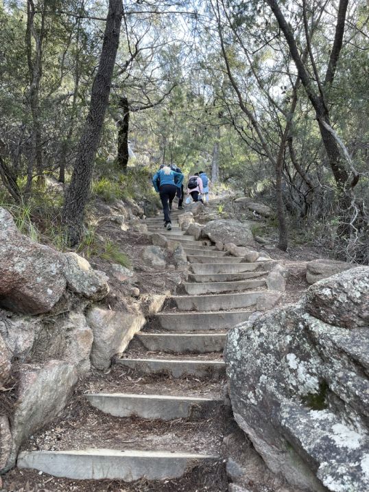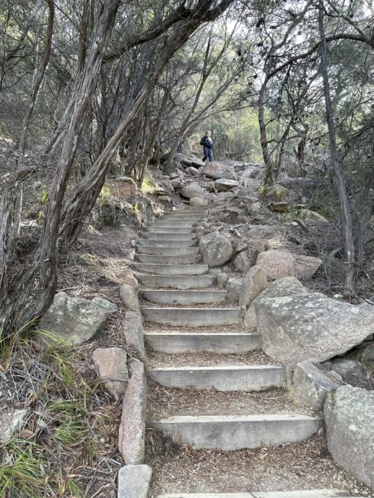 The stairs twist and turn through granite outcrops and tall eucalypts, with occasional breaks where we can catch our breath ,