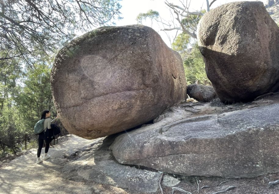 As we made our way up the trail, we passed by enormous granite boulders towering beside the path, these one are so massive they seemed almost impossibly balanced. One in particular caught our eye, its bulk tilted precariously, with most of its weight resting on the narrow edge of another granite platform below. It looked as if a single push could send it rolling, yet it had likely sat there for thousands of years, unmoved by time or weather.