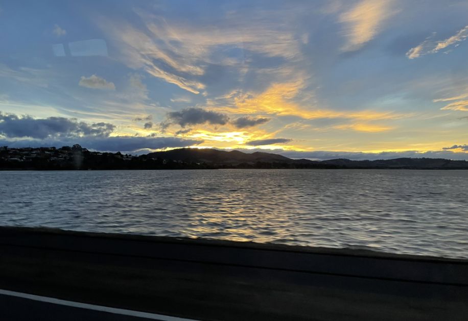 On our way back to Hobart along the A3, the bus crossed the Orielton Lagoon. The sun was beginning to set, casting a soft golden glow over the landscape. Through the windows, we could see the mountains in the distance, their slopes bathed in warm light, while gentle clouds drifted above them.