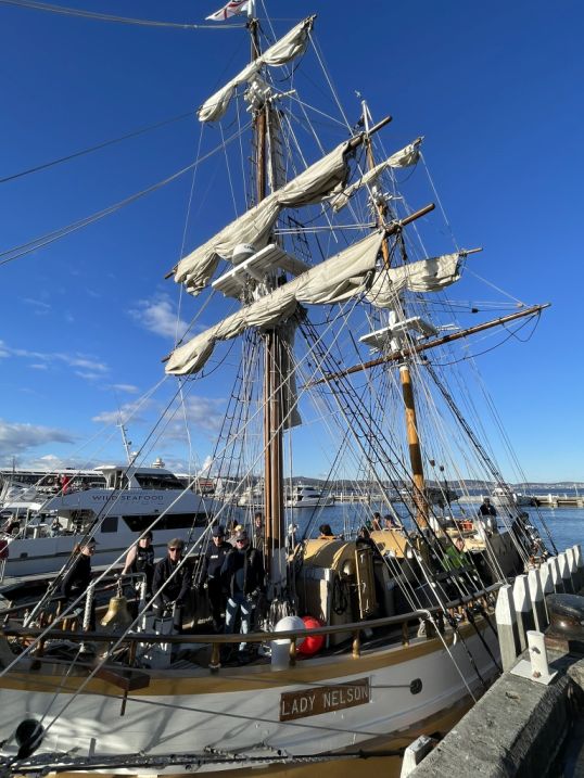 Moored nearby is the Lady Nelson, a graceful tall ship with white sails neatly furled and masts rising high against the sky.