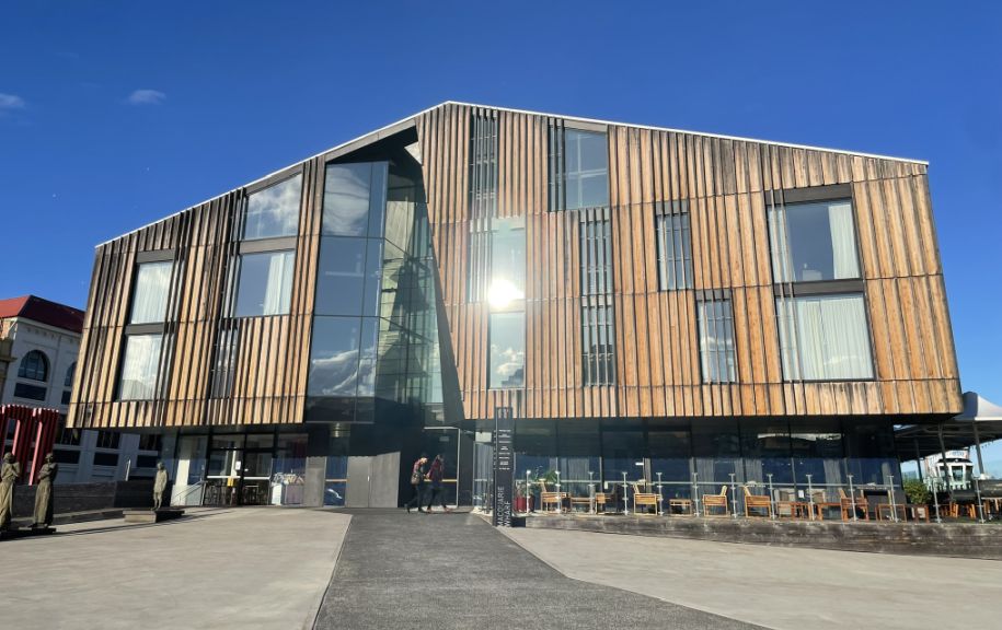 We are now right in the Hunter Street precinct, one of the most vibrant and historic corners of Hobart’s waterfront. The pink building is part of the University of Tasmania’s Centre for the Arts, which houses studios, exhibition spaces, and classrooms for visual and performing arts students. Right next to it is the Tasmanian Museum and Art Gallery (TMAG) complex. The glass façade you see is part of its modern extension, which connects beautifully with the older 19th-century buildings behind it.