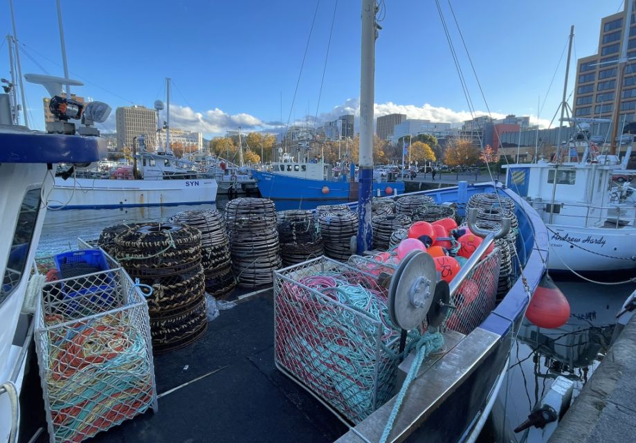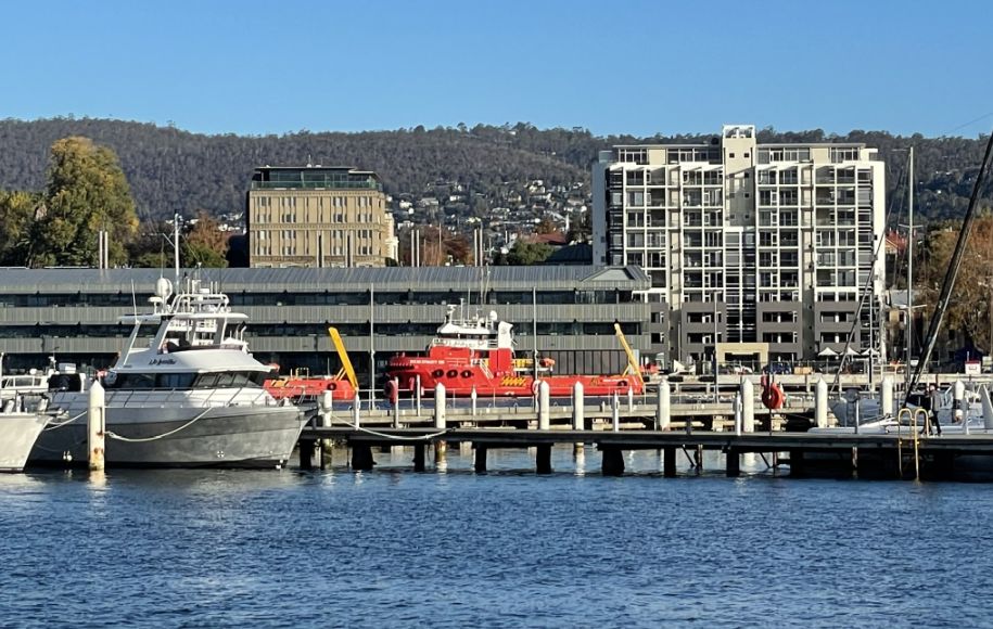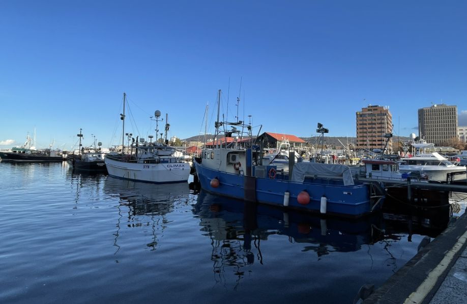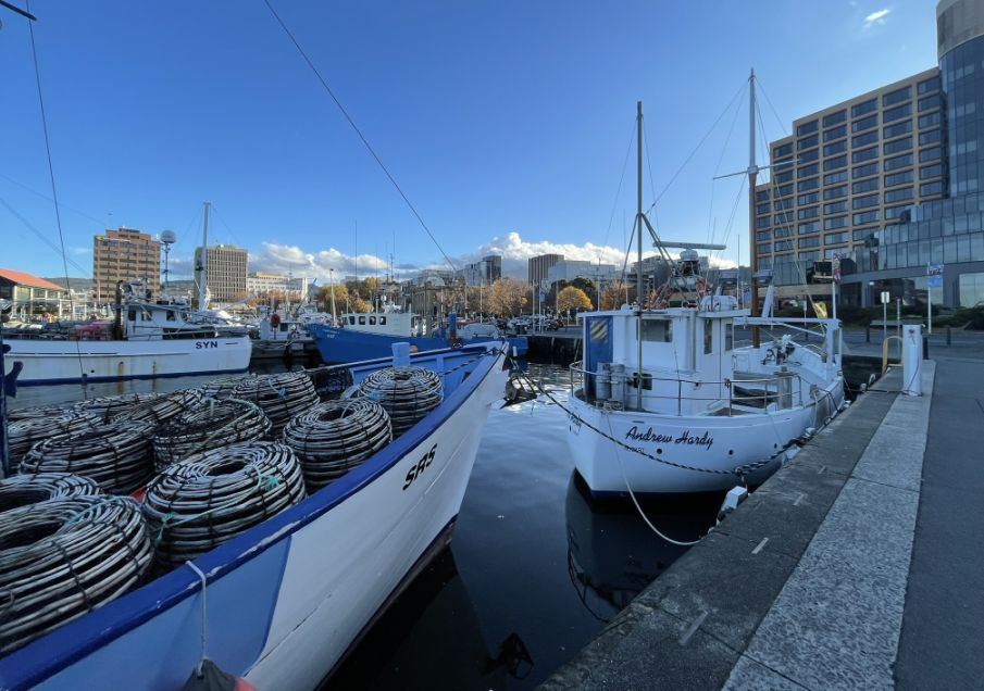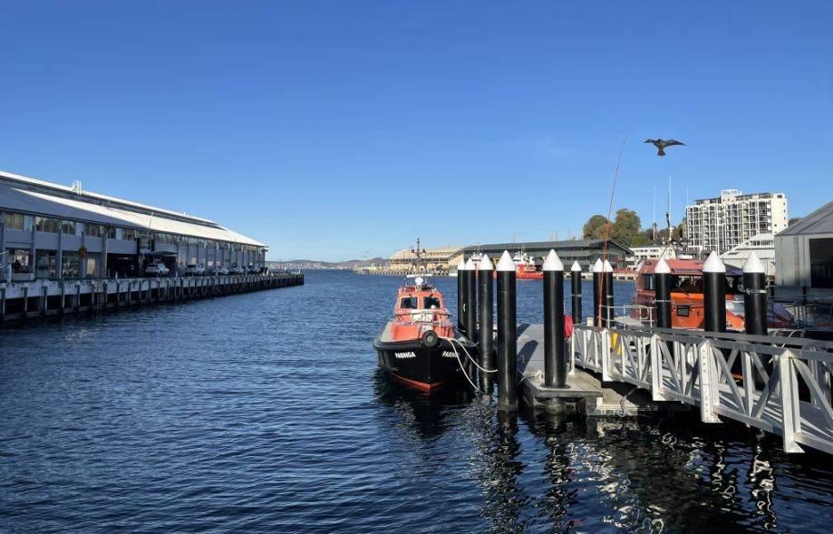 We are now at Hobart Port, the atmosphere instantly shifts, the soundscape opens up with the rhythmic creak of boats, the cry of seabirds, and the soft lapping of water against the pier.