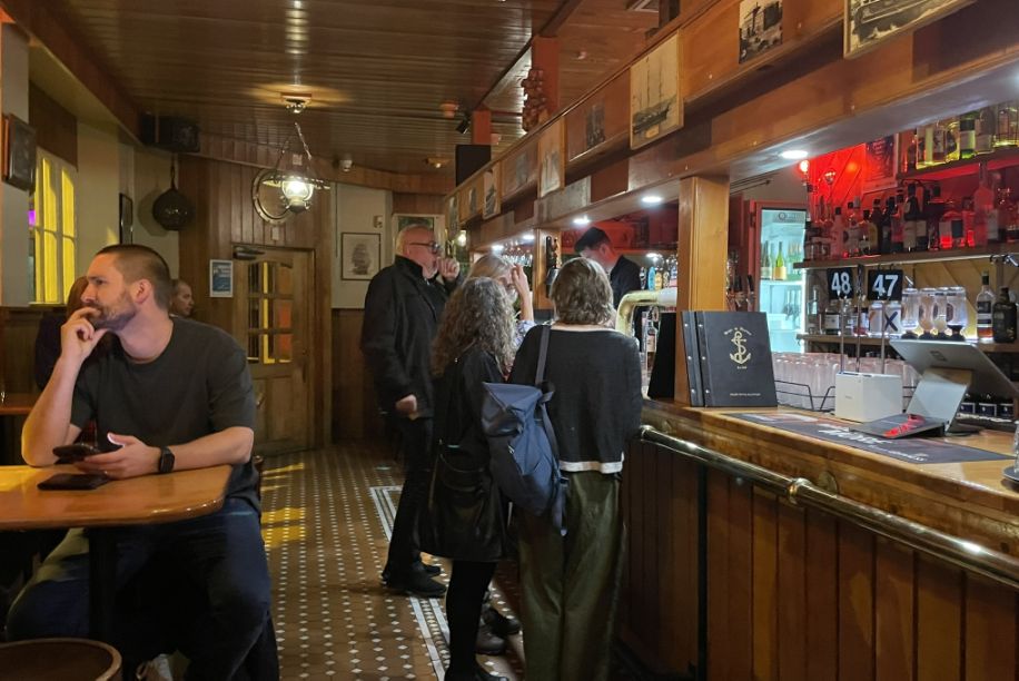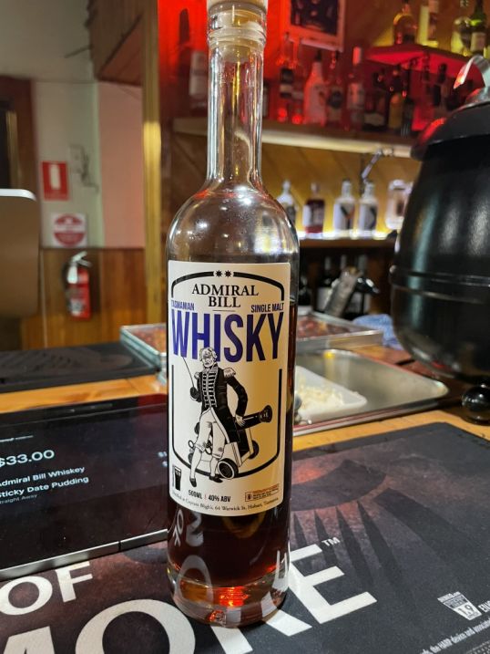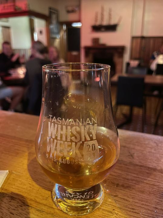 The bar area glows warmly under amber lights, its polished wooden counter reflecting rows of Tasmanian whiskies and local craft beers.