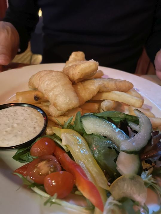 Fish and chips, tartare sauce, and salad were equally inviting with a generous fillet of local white fish, lightly battered to a crisp golden finish, paired with thick-cut chips and a side of tangy tartar sauce. The fish was delicate and flaky inside, the batter perfectly crunchy, and a squeeze of lemon brought out its fresh ocean flavor.