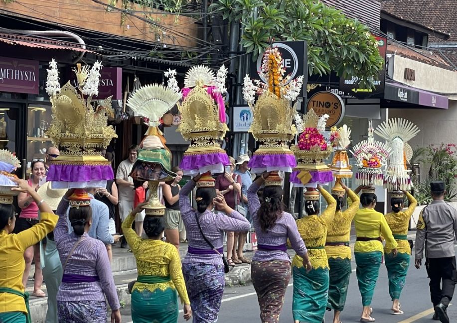 In the middle of the street we witnessed a Balinese ceremonial procession, a beautiful and very typical sight, especially in the morning. These processions often happen when a village group is headed to a temple for a ceremony or festival. In Balinese culture, women lead many ceremonial processions, carrying tall offerings on their heads, a practice called “Gebogan”.