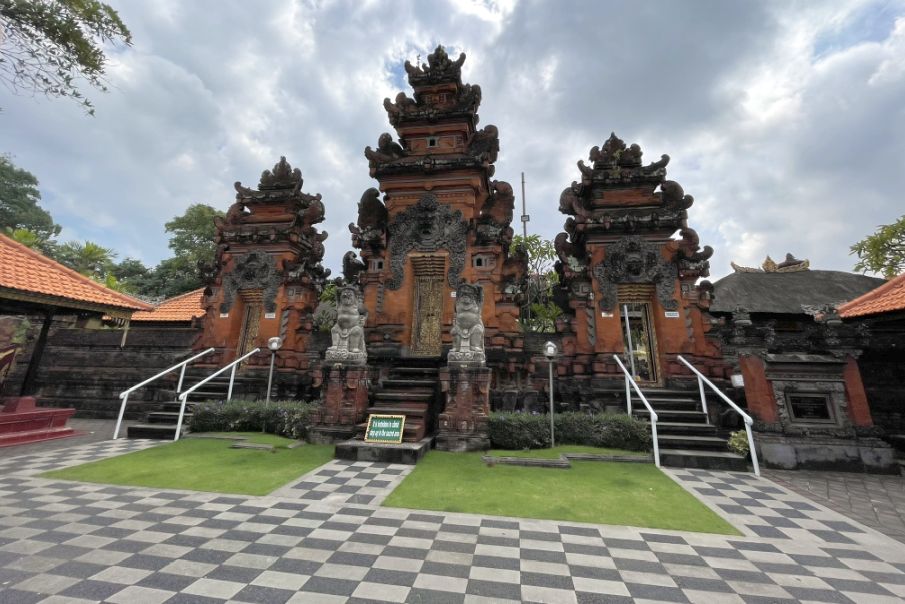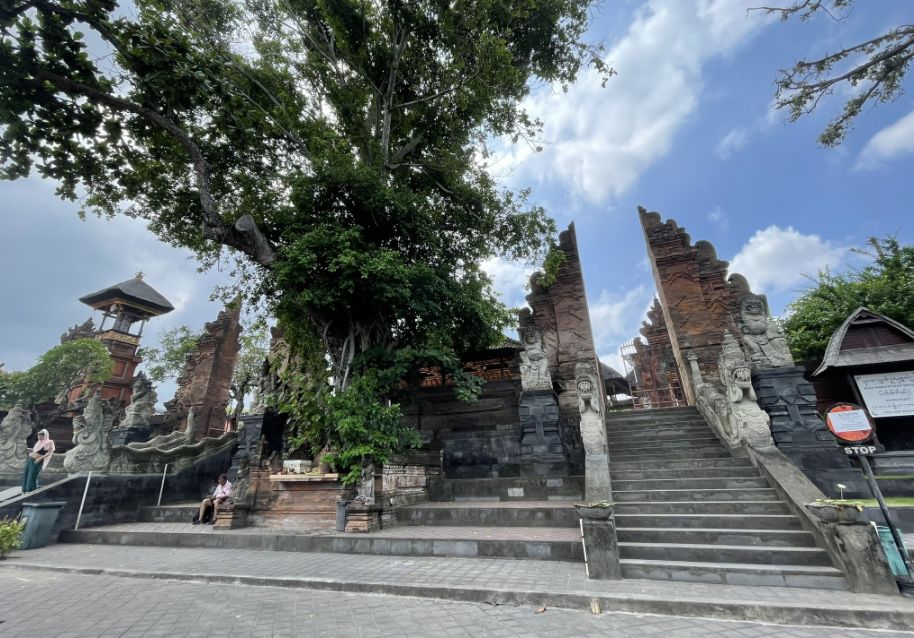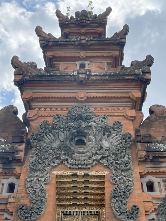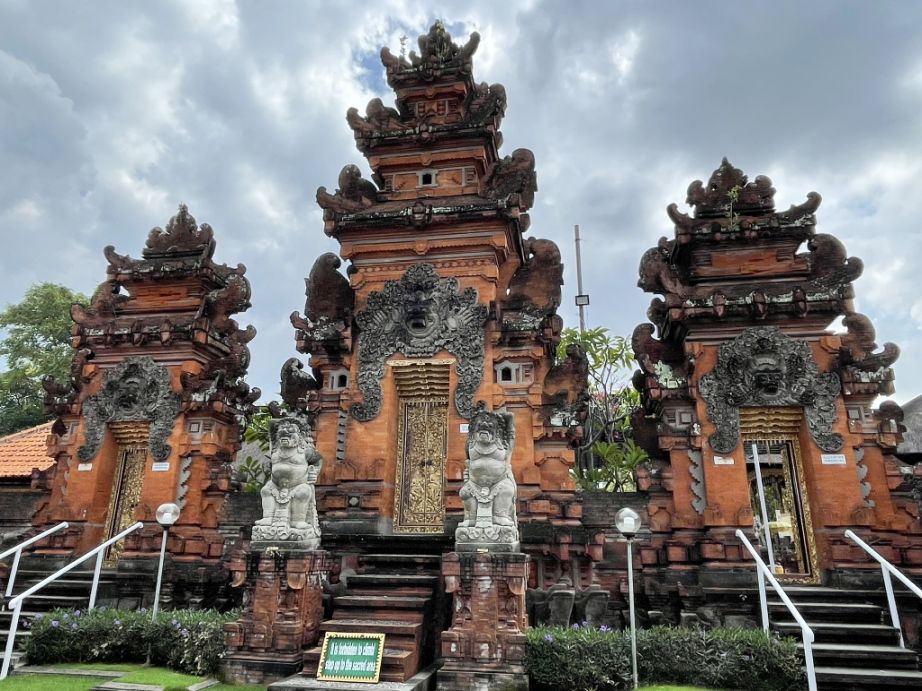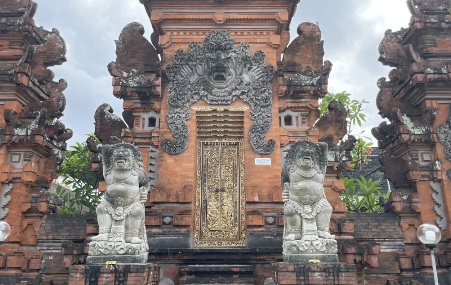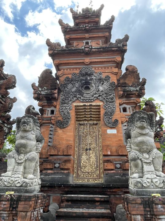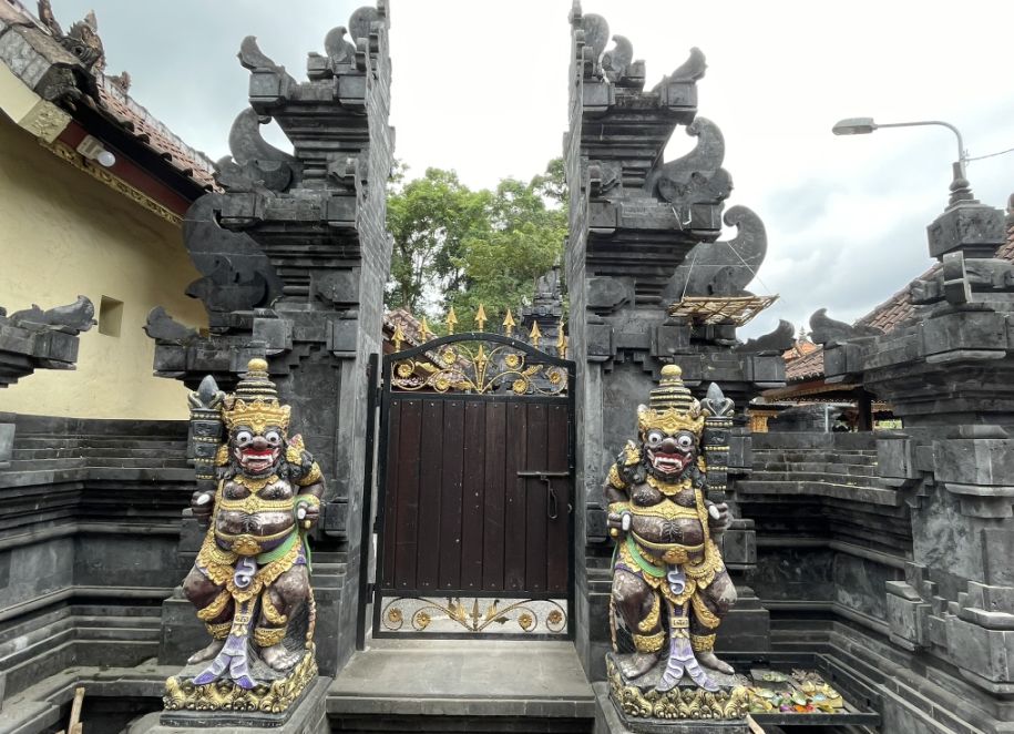 This gate is called a candi bentar, a split gateway that marks the entrance to the temple grounds. The two statues are guardian figures, often called dvarapala, whose job is to protect the temple from evil spirits.