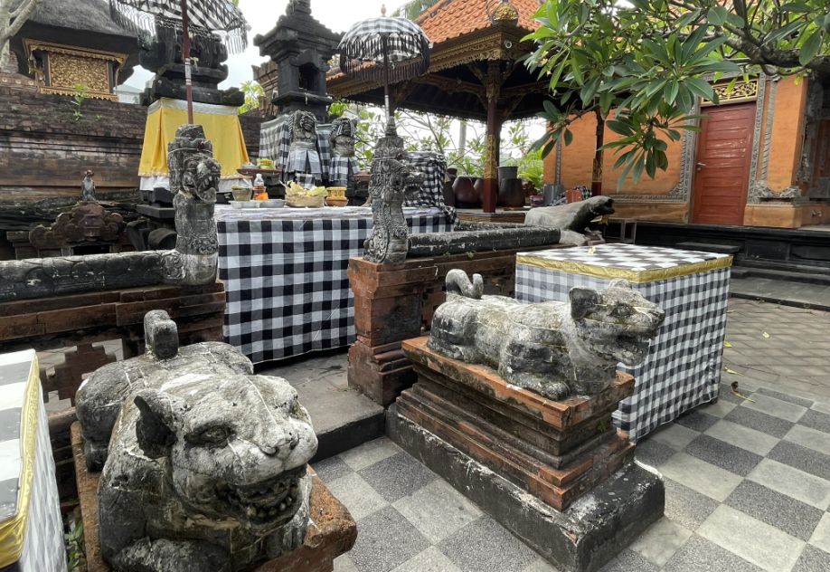 Stone shrines and altars decorated with checkered cloth (poleng) and daily offerings of flowers, incense, and woven palm trays.