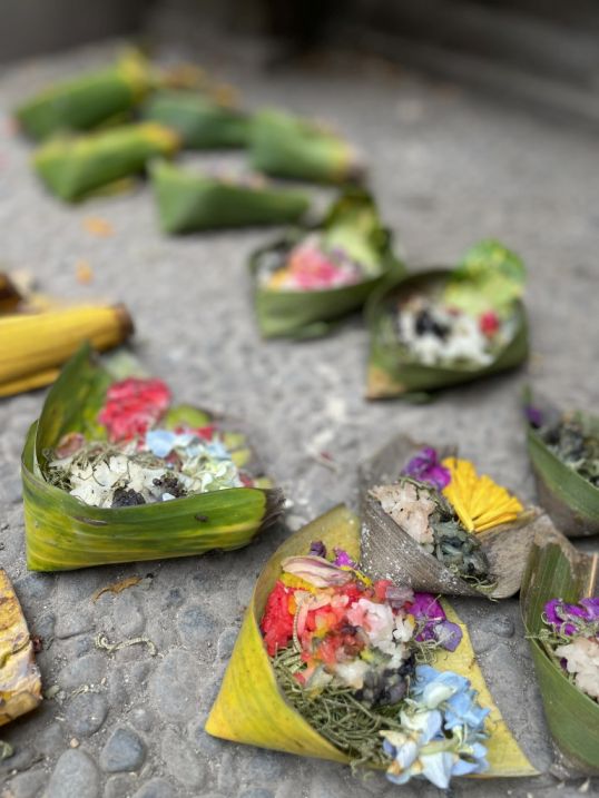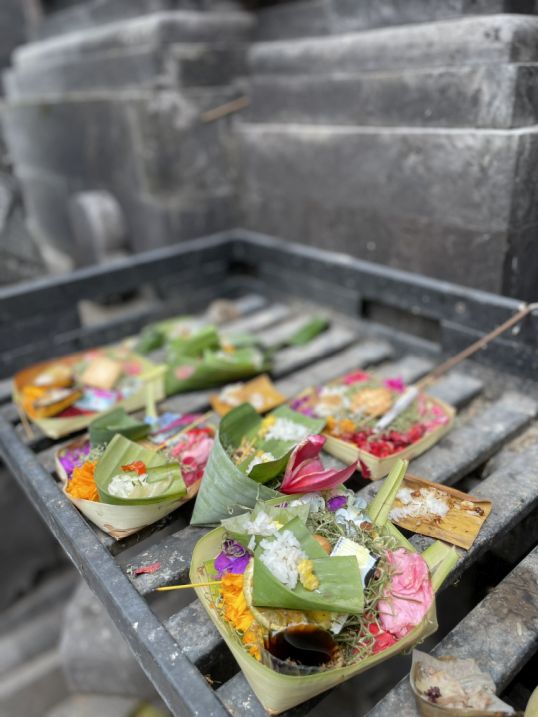 Colorful offerings are called canang sari with small trays made from palm leaves, filled with flowers, rice, and sometimes incense. These are daily offerings that Balinese Hindus leave to thank the gods, seek protection, and maintain harmony between the spiritual and physical worlds. Even though the temple is closed, these offerings show that it’s still very much alive as a place of devotion.