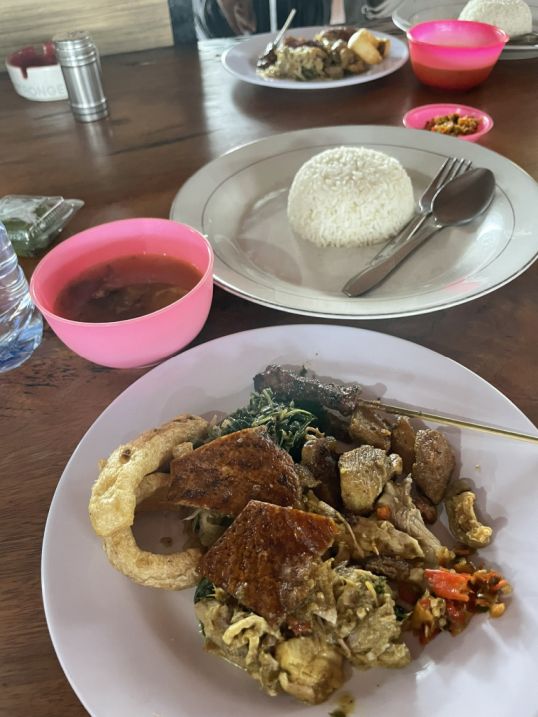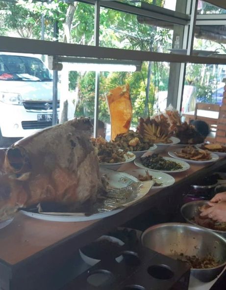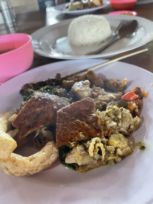 Our tour guide took us to a famous local Babi Fuling which is a traditional Balinese dish of roast suckling pig, famous across Bali for its flavorful, aromatic preparation. The pig is usually spit-roasted whole over an open fire, with a rich spice mixture called bumbu, which often includes turmeric, garlic, coriander, lemongrass, ginger, and chili.