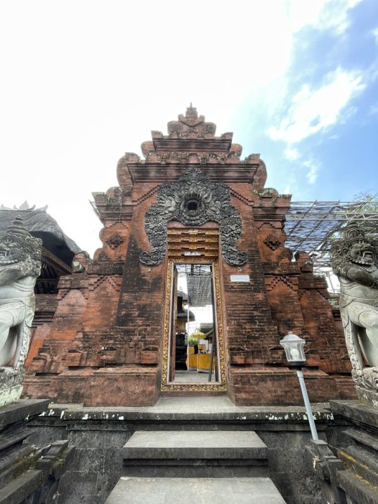We are now inside the temple looking out. The entrance gate is made of stone that weathered, reddish-brown texture typical of older Balinese temples, giving the entrance a feeling of age and reverence.