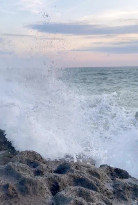 Huge waves crashing against the black volcanic rocks.