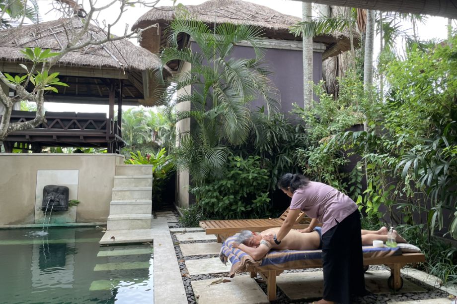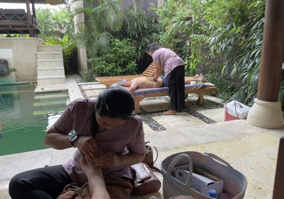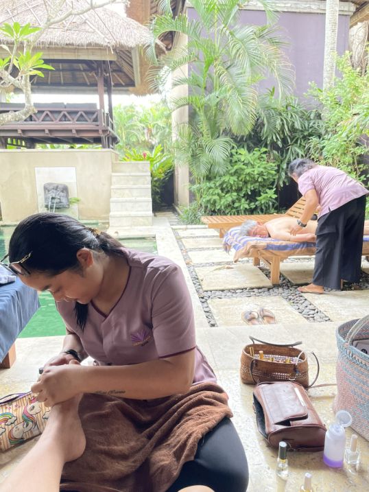 At many villas in Bali, especially in quieter areas like Seseh, spa services are offered in-villa, meaning therapists come directly to our space so we don’t have to travel anywhere. It creates a private, serene experience where you can enjoy a massage or a manicure-pedicure right in the comfort of your villa, with the sounds of the pool nearby.