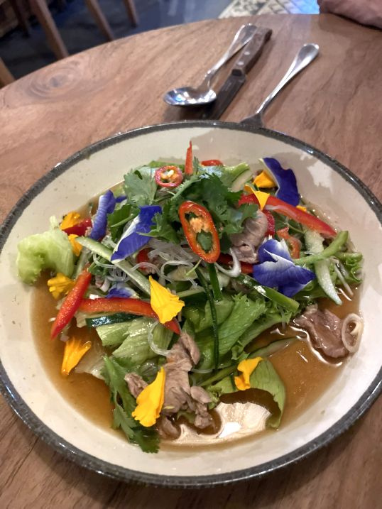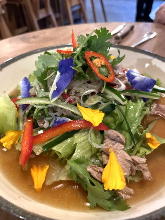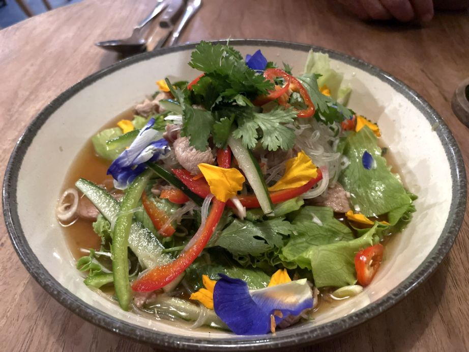 We share a beef Salad with fresh vegetable, and glass noodles.