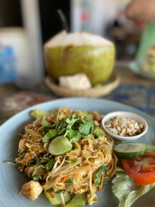 I ordered a pad Thai and Hoa had a chicken sandwich with French fries, and I also ordered a fresh coconut juice.