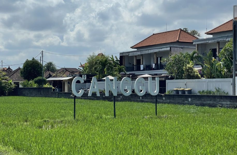 Canggu sign in the open green field is a popular little photo spot, kind of a marker that you’ve arrived in the heart of Canggu. A lot of people stop there for pictures because it captures that mix of open space and the lively town around it.