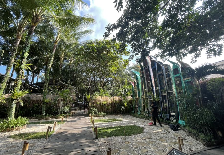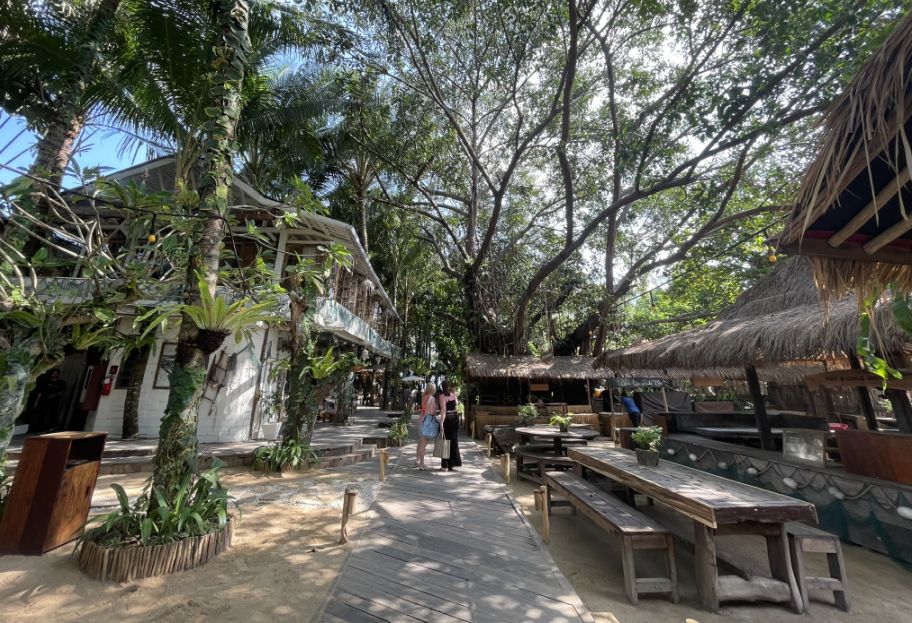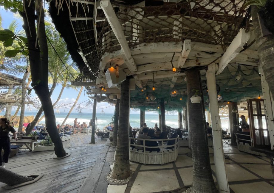 As we walked deeper into La Brisa, it unfolds almost like a little seaside village made from driftwood and palms. First we passed those long wooden tables under a roof of dried, woven leaves, it feels airy and rustic.