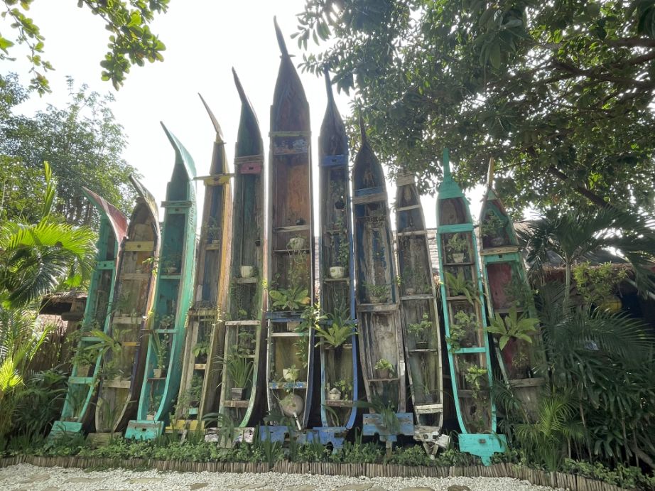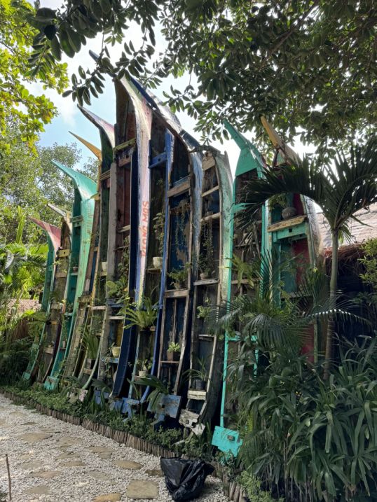 Those old boats you’re seeing hanging vertically are one of La Brisa’s signature design features. They come from real, retired Balinese fishing boats, many of them decades old, which were reclaimed and repurposed when the beach club was built.