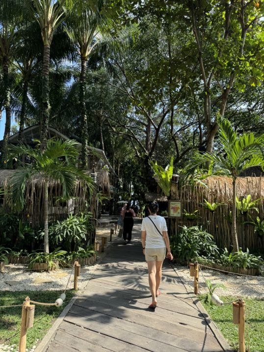 Then we stepped into the central courtyard, where tall palm trees rise up in the middle The space feels open and breezy, with wooden walkways leading in different directions.