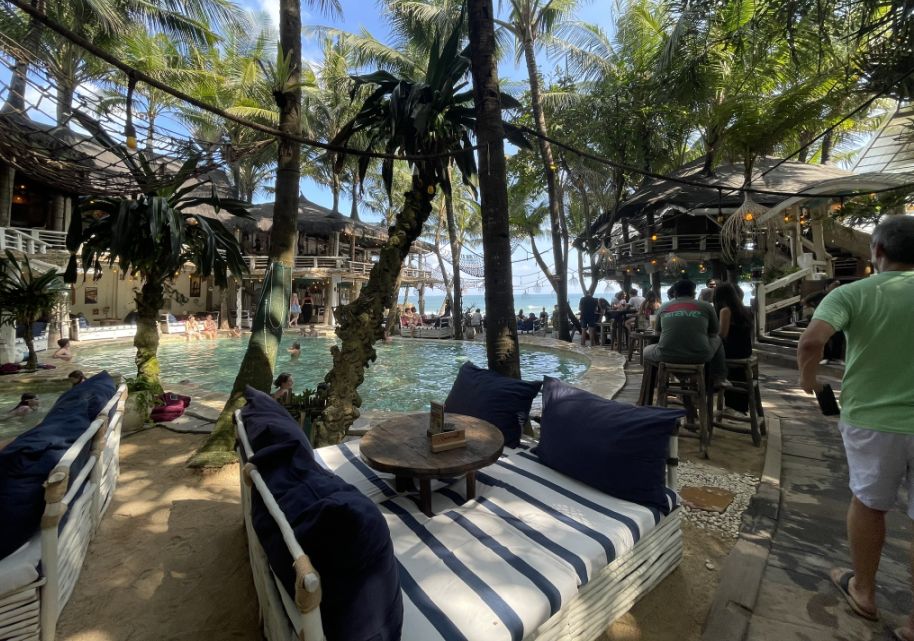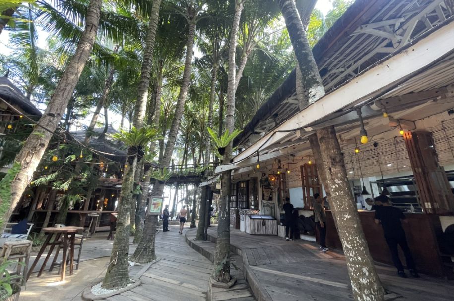 As we made our way deeper inside, the place really opens up. The wooden walkways stretch out in different directions, all weathered and sun-bleached, giving everything that relaxed, lived-in Bali charm. Along the sides you see tables, chairs, and colorful bean bags scattered everywhere, nothing too uniform, just a very casual, beachy flow.
