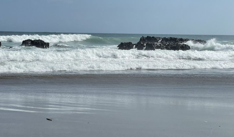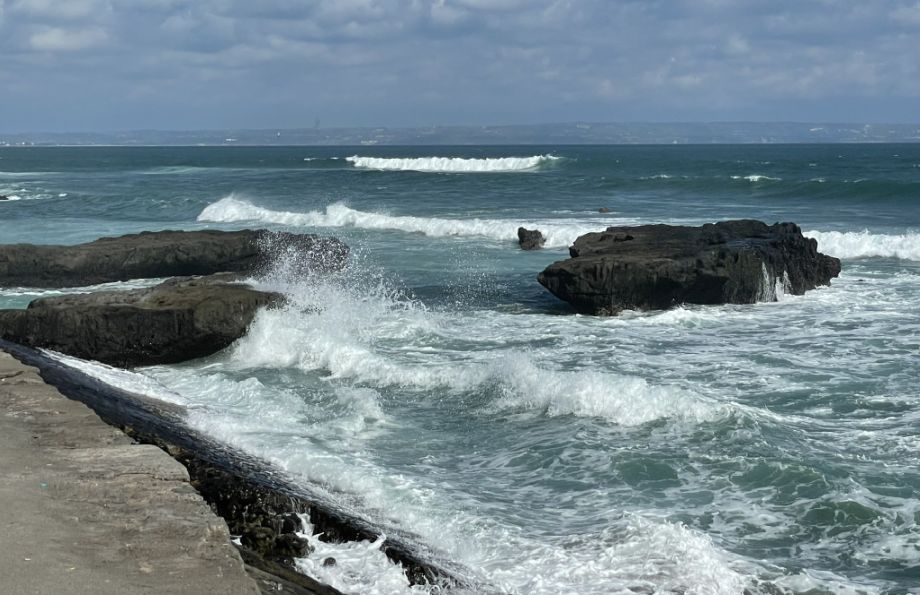 From our vantage point on the cement platform at Echo Beach, the scene is striking. Below are massive black volcanic rocks jut out of the ocean, forming natural barriers that the waves relentlessly crash against. The water around them churns with frothy white spray, and the rhythm of the surf creates a sense of raw, untamed energy.