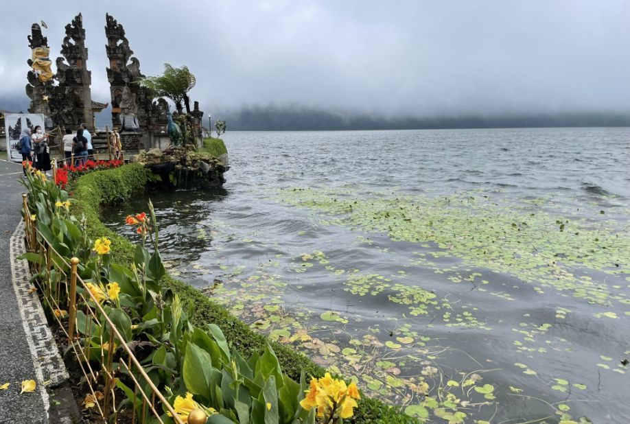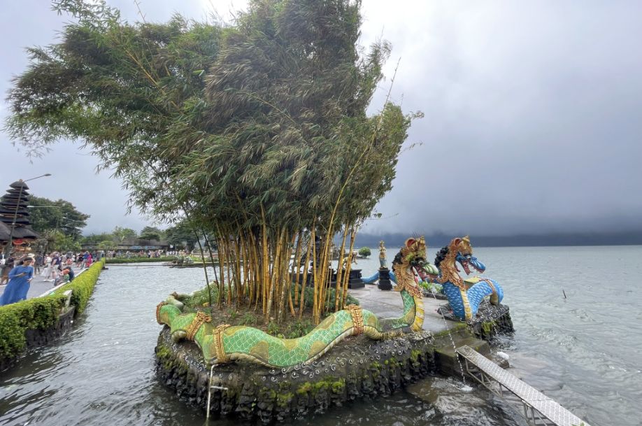 As we walked closer to the lakeshore at Ulun Danu Beratan, the cemented round platform with the blue-and-green dragon figure is one of the small lakeside shrines built slightly offshore. It adds a dramatic, almost floating appearance to the temple scenery.