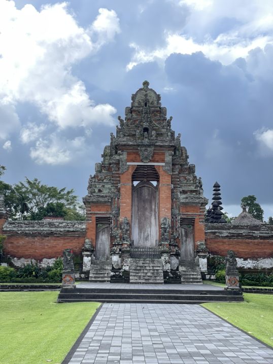 These statues are some of the most vibrant in Bali. Ahead is the main split gate, the iconic Balinese candi bentar.