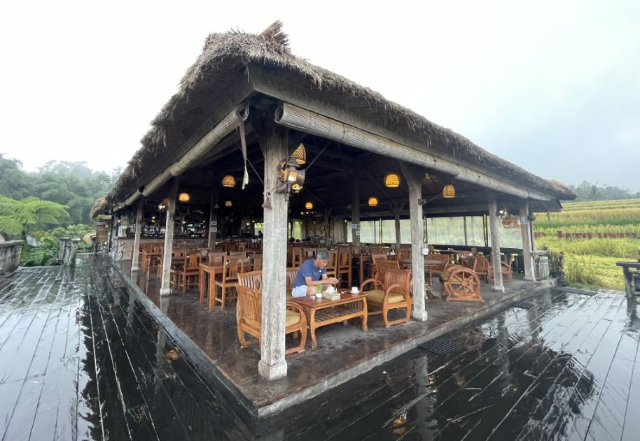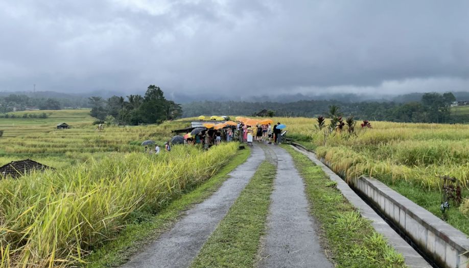 From the coffee shop terrace, the rain still lightly falling, we had a perfect elevated view of the landscape, and right below you, across the golden field, stood the huge letters spelling “Gong Jatiluwih.” They rise prominently against the terraces, almost like a landmark welcoming visitors to this UNESCO-protected valley. With the soft morning light, the letters looked almost cinematic, framed by layers of golden rice paddies behind them.
