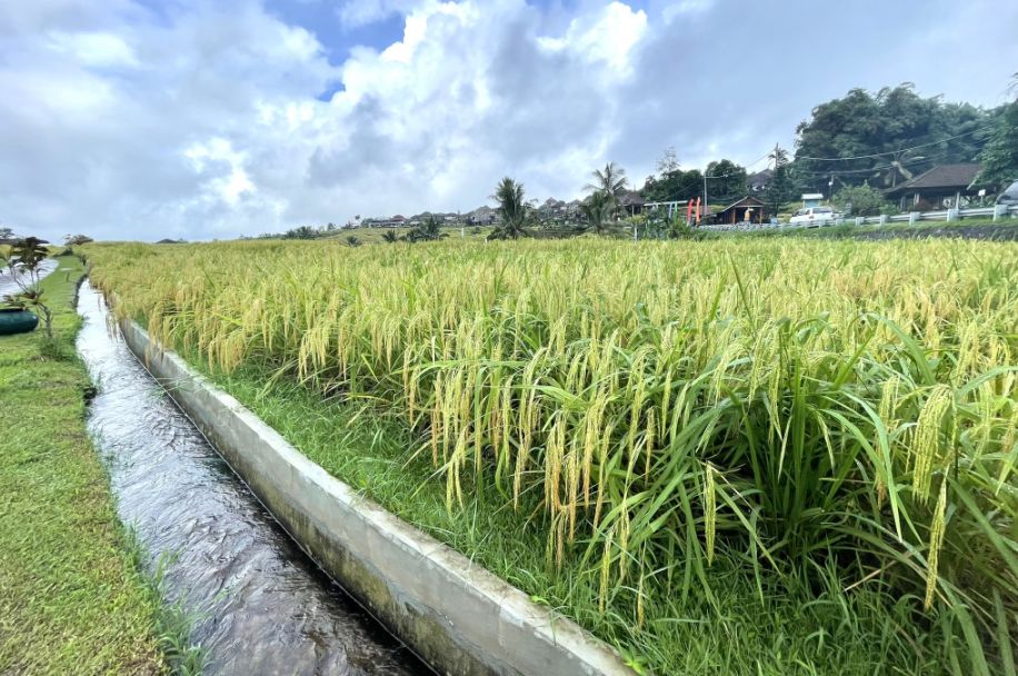 Being right next to the rice field where the stalks are full of grains gives a tangible experience of the harvest season. You can hear the subtle rustling of the heavy grain heads in the breeze, and see the weight of the kernels making the stalks bow slightly. This is the moment of peak abundance, reflecting the immense effort of the Subak community.