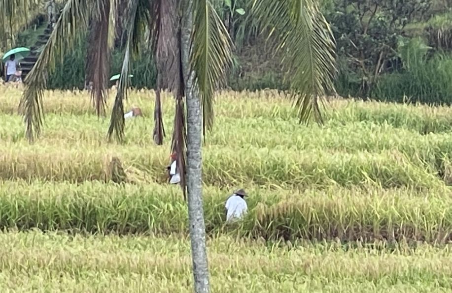 Our tour guide told us that since the rice is golden (meaning fully mature), the two workers you see are probably cutting the rice stalks by hand using a small, specialized sickle called an ani-ani. It’s a labor-intensive but communal process in the Subak system.