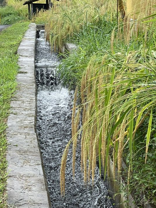 Next the rice filed is the irrigation canal, the golden rice fields, and the peaceful scenery that makes Jatiluwih feel so timeless. As we walked along the path, the irrigation canal becomes one of the most beautiful and calming parts of the Jatiluwih experience. It runs right beside the edge of the elevated rice fields that rise just above it. The water moves gently but steadily.