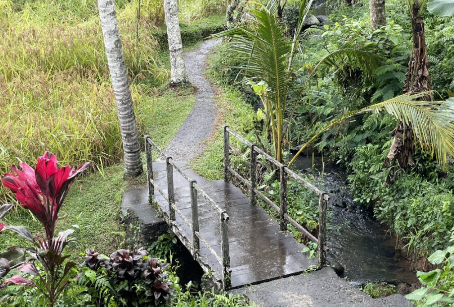 The wooden bridge allows people to cross the vital canal without disrupting the flow of water. The entire system is governed by complex social and spiritual rituals that ensure every farmer gets an equal share of the water across the Canal is a crucial part of the Subak water management system.
