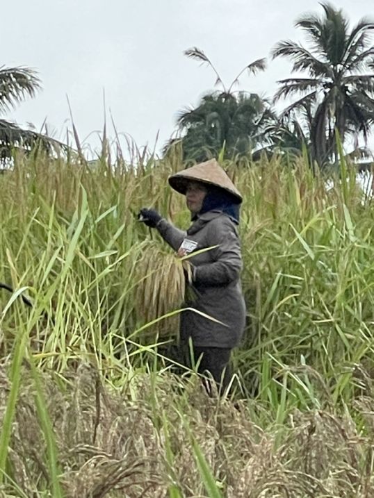 A lady performing the harvest in the traditional Balinese way, which connects back to the spiritual significance of the rice plant.