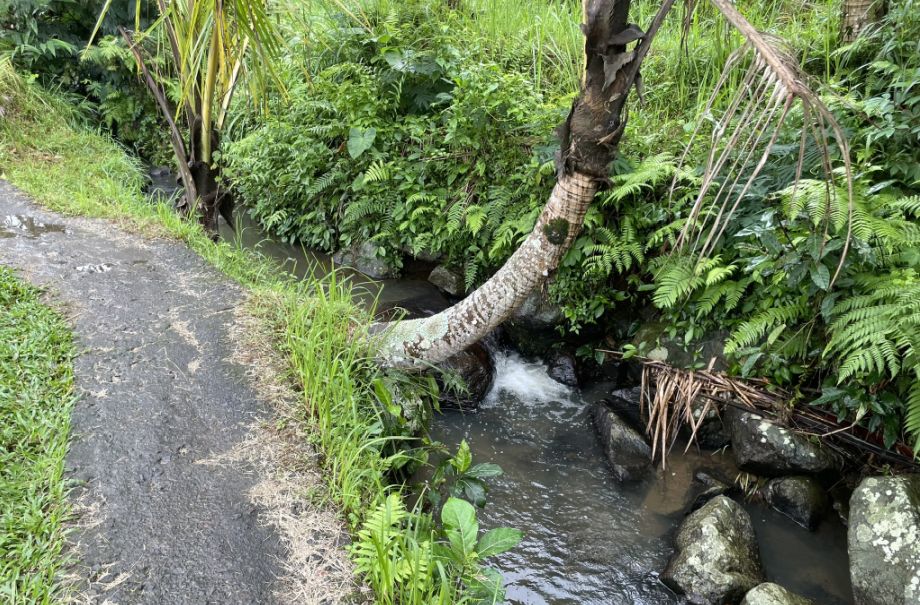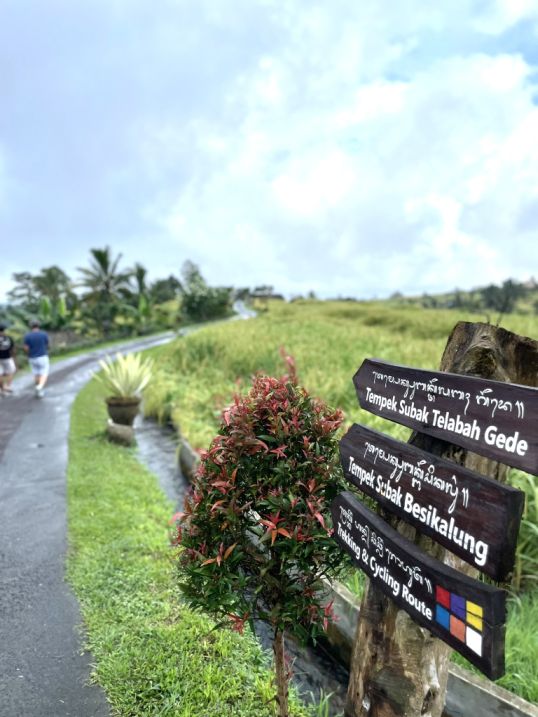 We followed the path downhill toward the terraces. That’s when we came across a cluster of arrow signs, one of them saying: Tempek Subak Telabah Gede. This is not just a direction marker; it’s the name of one of the sub-groups (tempek) within the larger subak system of Jatiluwih. We are now stepping into an area that is part of the living heritage system, where farmers still maintain the canals, plant and harvest rice in harmony, and uphold traditions passed down for centuries.