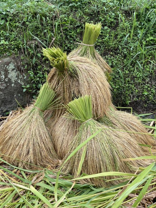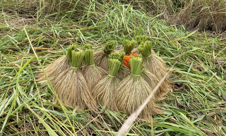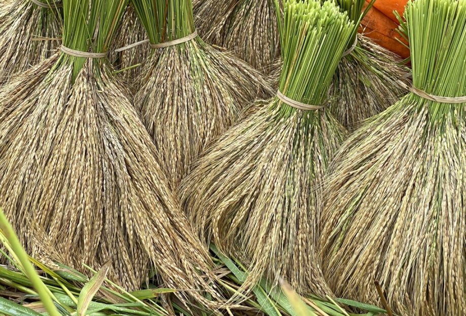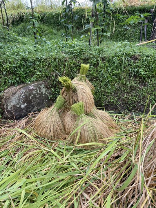 The individual rice heads, cut respectfully from the stalk, are quickly grouped together and tied into small, manageable sheaves.