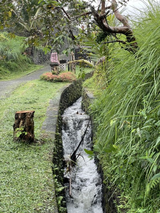 Sometimes the canal is made of smooth cement, sometimes older stone, and in a few places it narrows into a small bamboo pipe where water spills down into the next terrace. Each drop of water is part of a larger network that connects the mountain springs, the temple, and every farmer in the valley.